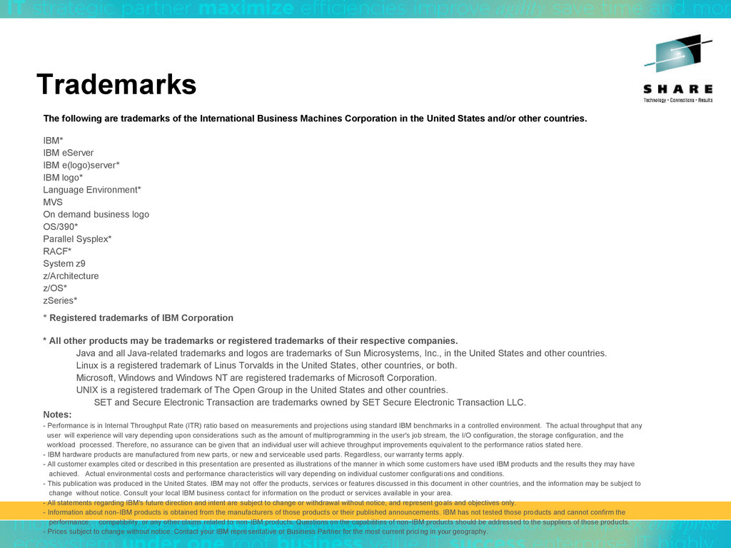 of their respective companies. Java and all Java-related trademarks and logos are trademarks of Sun Microsystems, Inc., in the United States and other countries. Linux is a registered trademark of Linus Torvalds in the United States, other countries, or both. Microsoft, Windows and Windows NT are registered trademarks of Microsoft Corporation. UNIX is a registered trademark of The Open Group in the United States and other countries. SET and Secure Electronic Transaction are trademarks owned by SET Secure Electronic Transaction LLC. Notes: - Performance is in Internal Throughput Rate (ITR) ratio based on measurements and projections using standard IBM benchmarks in a controlled environment. The actual throughput that any user will experience will vary depending upon considerations such as the amount of multiprogramming in the user's job stream, the I/O configuration, the storage configuration, and the workload processed. Therefore, no assurance can be given that an individual user will achieve throughput improvements equivalent to the performance ratios stated here. - IBM hardware products are manufactured from new parts, or new and serviceable used parts. Regardless, our warranty terms apply. - All customer examples cited or described in this presentation are presented as illustrations of the manner in which some customers have used IBM products and the results they may have achieved. Actual environmental costs and performance characteristics will vary depending on individual customer configurations and conditions. - This publication was produced in the United States. IBM may not offer the products, services or features discussed in this document in other countries, and the information may be subject to change without notice. Consult your local IBM business contact for information on the product or services available in your area. - All statements regarding IBM's future direction and intent are subject to change or withdrawal without notice, and represent goals and objectives only. - Information about non-IBM products is obtained from the manufacturers of those products or their published announcements. IBM has not tested those products and cannot confirm the performance, compatibility, or any other claims related to non-IBM products. Questions on the capabilities of non-IBM products should be addressed to the suppliers of those products. - Prices subject to change without notice. Contact your IBM representative or Business Partner for the most current pricing in your geography. The following are trademarks of the International Business Machi The following are trademarks of the International Business Machines Corporation in the United States and/or other countries. nes Corporation in the United States and/or other countries. IBM* IBM eServer IBM e(logo)server* IBM logo* Language Environment* MVS On demand business logo OS/390* Parallel Sysplex* RACF* System z9 z/Architecture z/OS* zSeries* * Registered trademarks of IBM Corporation Trademarks