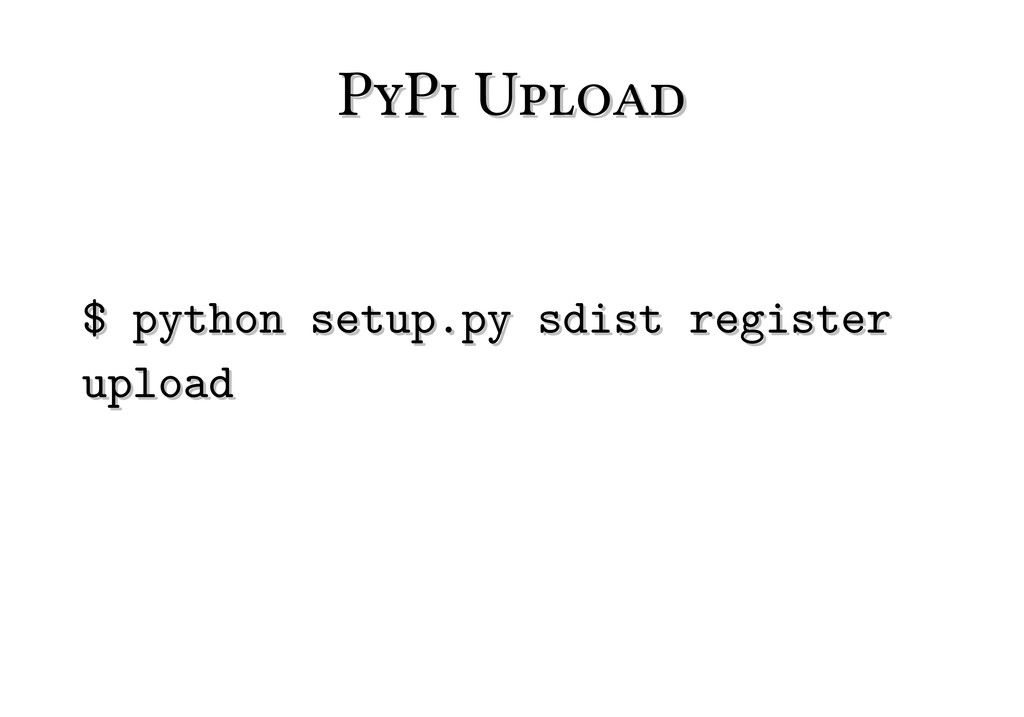 register upload $ python setup.py sdist register upload ... ... Creating tar archive Creating tar archive removing 'rst2odp-0.2.4' (and everything under it) removing 'rst2odp-0.2.4' (and everything under it) running register running register running check running check We need to know who you are, so please choose either: We need to know who you are, so please choose either: 1. use your existing login, 1. use your existing login, 2. register as a new user, 2. register as a new user, 3. have the server generate a new password for you (and email it to you), 3. have the server generate a new password for you (and email it to you), or or 4. quit 4. quit Your selection [default 1]: Your selection [default 1]: 1 1