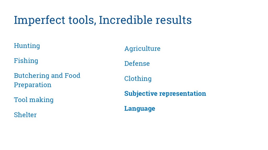 Since then, of course, humans have created and adapted increasingly complex and specialized tools. Through each phase of growth, humans unlocked new abilities, reliable food supplies, resilient dwellings, longer life spans, and a higher quality of life by adopting more productive and efficient tools. As engineers we have come to recognize and appreciate the benefits of specialized tooling. Indeed, our modern DevOps growth is fueled by the maturity and adoption of many specialized tools: Configuration Management, CI/CD, The Cloud, Containers, and more.