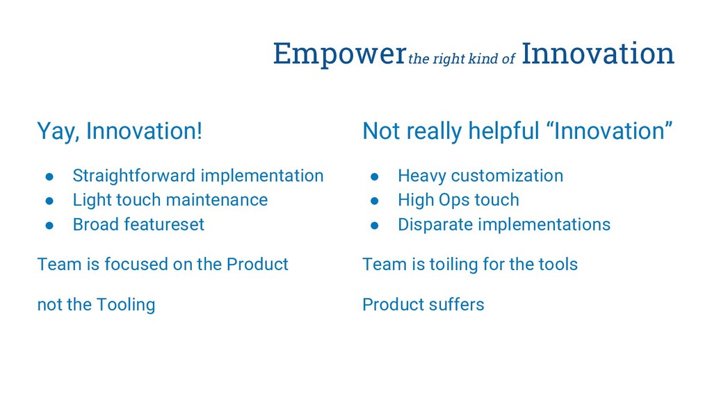 As DevOps practitioners, we are all familiar with the tension present around tools in our culture. We love working with tools, new and old, generic and specialized, clever and obfuscated. We are a tool loving tribe. Frequently however, that very fascination can create an explosion of tool adoption - every team, every engineer their own island of preferred ways to accomplish similar tasks. What is often overlooked, is how this fragmented approach to tooling is an anti-pattern in DevOps, creating barriers to collaboration, isolating teams in silos, and creating toil implementing the same method in new tools.