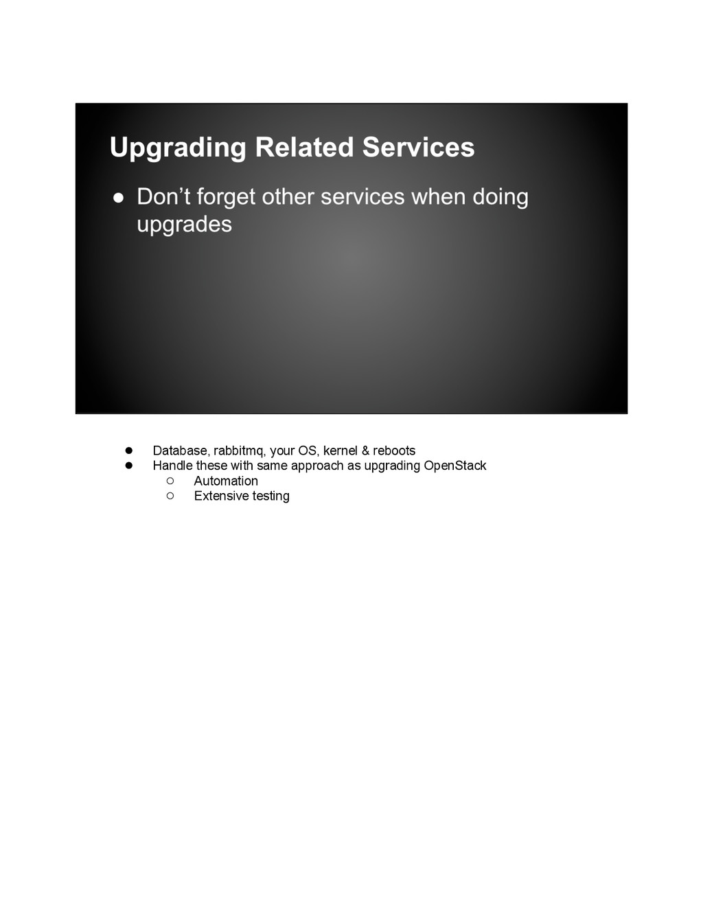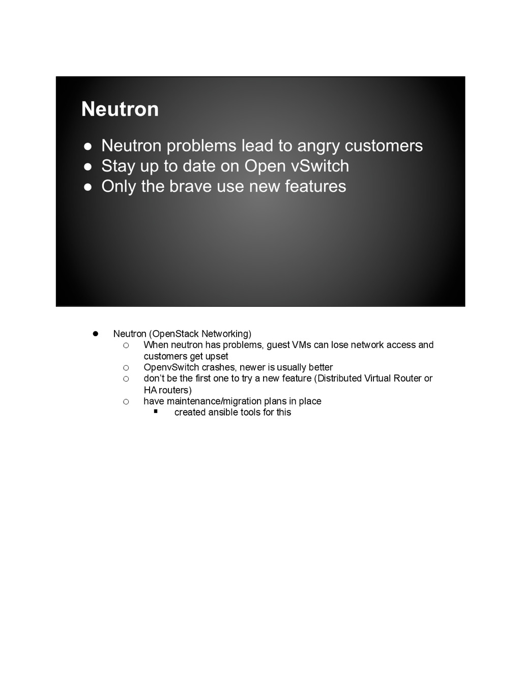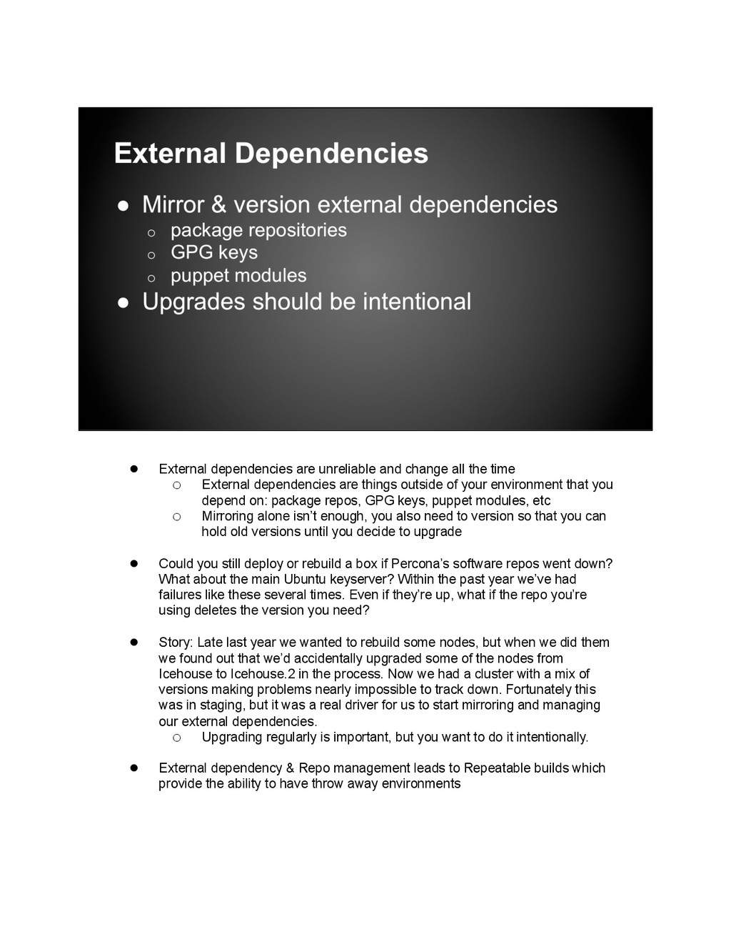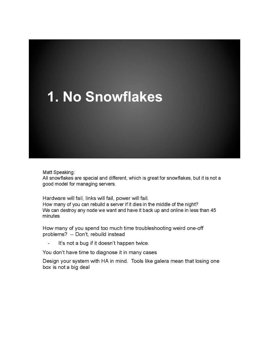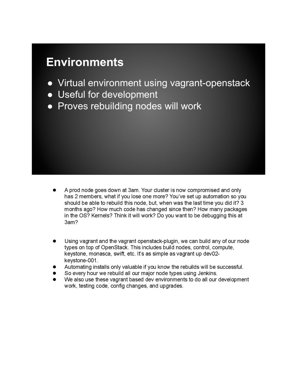 is now compromised and only has 2 members, what if you lose one more? You’ve set up automation so you should be able to rebuild this node, but, when was the last time you did it? 3 months ago? How much code has changed since then? How many packages in the OS? Kernels? Think it will work? Do you want to be debugging this at 3am? • Using vagrant and the vagrant openstack-plugin, we can build any of our node types on top of OpenStack. This includes build nodes, control, compute, keystone, monasca, swift, etc. It’s as simple as vagrant up dev02- keystone-001. • Automating installs only valuable if you know the rebuilds will be successful. • So every hour we rebuild all our major node types using Jenkins. • We also use these vagrant based dev environments to do all our development work, testing code, config changes, and upgrades.