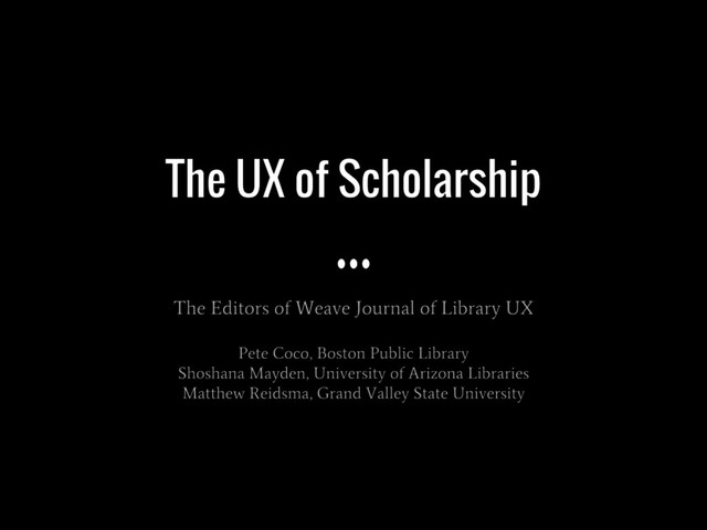 User Experience (UX) techniques are used to improve websites, services, and even physical spaces. But what about Academic Scholarship? At Weave: The Journal of Library User Experience, the editors and editorial board are all UX practitioners, so using UX techniques comes naturally when improving the journal for both authors and readers. We've redesigned the submission process and editorial workflows based on author experiences, and have made a number of changes to improve the value and experience of Weave's content for our readers.