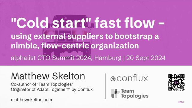 In this talk, Matthew Skelton - co-author of ‘Team Topologies’ and originator of Adapt Together™️ - shares how a blend of external suppliers and in-house staff can provide a advantage over purely home-grown talent as the organization builds its “digital muscles”; by taking advantage of the natural boundaries between suppliers, a flow-centric architecture can emerge more quickly.