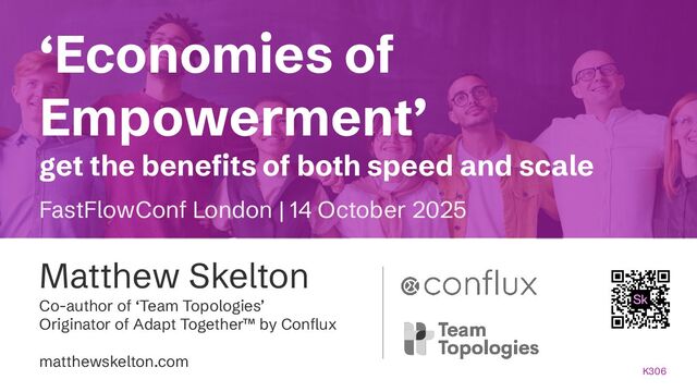 In this talk, Matthew Skelton - co-author of the groundbreaking book Team Topologies and CEO/CTO at Conflux - shares insights from helping hundreds of organizations to apply principles and practices from Team Topologies, Adapt Together™, and related approaches in order to scale nimble value delivery via empowered teams and “Economies of Empowerment”.