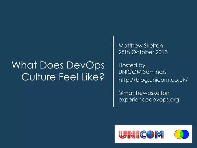 In this webinar we'll explore what is DevOps culture, why it's important, and how it differs from many typical organisational cultures and why. We'll see some simple things we can do to help nurture a DevOps culture within our organisations, and investigate some collaboration and team patterns which can help to change behaviour to encourage DevOps to flourish.