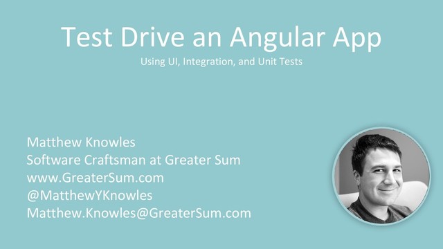 Test Driven Development(TDD) is a technique for writing software where tests drive the design of your code. Matthew will be using Protractor and Jasmine to test drive an Angular app showing participants a few ways to write failing UI, integration, and unit tests that will drive the design of your code.