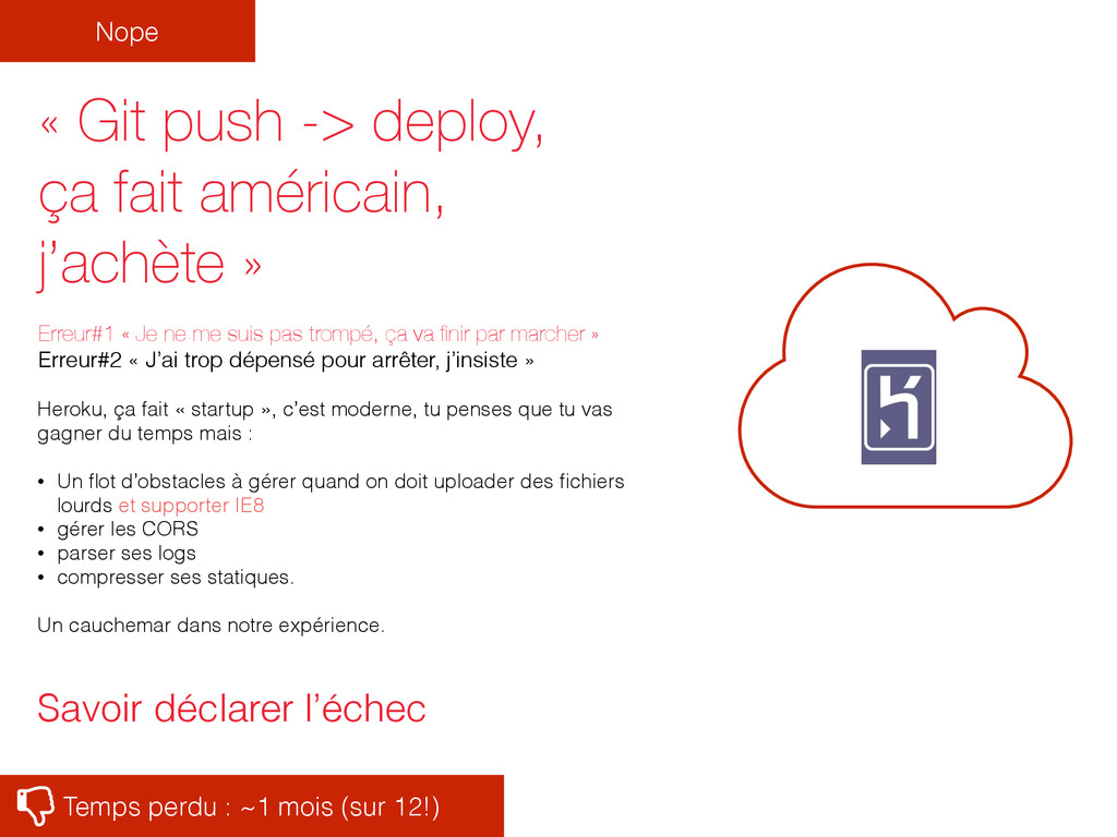 Heroku, ça fait « startup », c’est moderne, tu penses que tu vas gagner du temps mais : ! • Un flot d’obstacles à gérer quand on doit uploader des fichiers lourds et supporter IE8 • gérer les CORS • parser ses logs • compresser ses statiques. ! Un cauchemar dans notre expérience. ! ! Savoir déclarer l’échec Nope Temps perdu : ~1 mois (sur 12!) # 3 Erreur#1 « Je ne me suis pas trompé, ça va finir par marcher » Erreur#2 « J’ai trop dépensé pour arrêter, j’insiste »