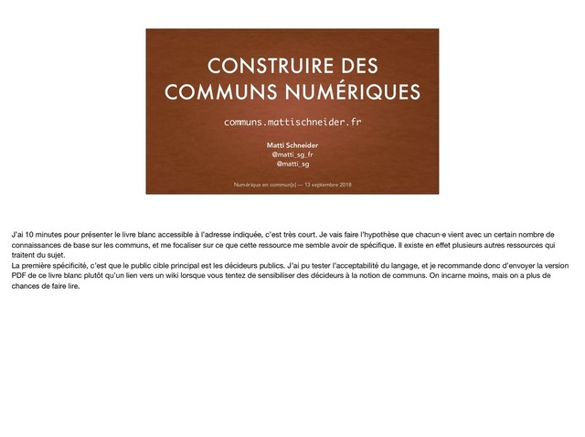2018 Matti Schneider @matti_sg_fr @matti_sg communs.mattischneider.fr J’ai 10 minutes pour présenter le livre blanc accessible à l’adresse indiquée, c’est très court. Je vais faire l’hypothèse que chacun·e vient avec un certain nombre de connaissances de base sur les communs, et me focaliser sur ce que cette ressource me semble avoir de spécifique. Il existe en effet plusieurs autres ressources qui traitent du sujet. La première spécificité, c’est que le public cible principal est les décideurs publics. J’ai pu tester l’acceptabilité du langage, et je recommande donc d’envoyer la version PDF de ce livre blanc plutôt qu’un lien vers un wiki lorsque vous tentez de sensibiliser des décideurs à la notion de communs. On incarne moins, mais on a plus de chances de faire lire.