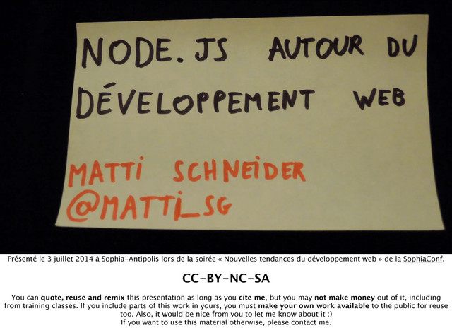 la soirée « Nouvelles tendances du développement web » de la SophiaConf. CC-BY-NC-SA You can quote, reuse and remix this presentation as long as you cite me, but you may not make money out of it, including from training classes. If you include parts of this work in yours, you must make your own work available to the public for reuse too. Also, it would be nice from you to let me know about it :) If you want to use this material otherwise, please contact me.