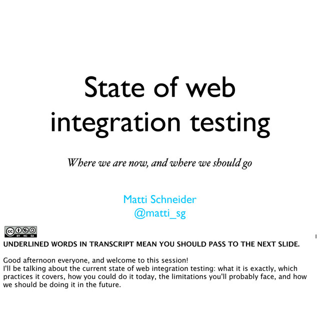 Automated web integration testing is very powerful, yet still a messy business. This session aims at making this messy ground clearer through proper definitions, an overview of the state of the art, presentation of current best practices, and a reflection on what this domain is still missing to reveal its full strength.