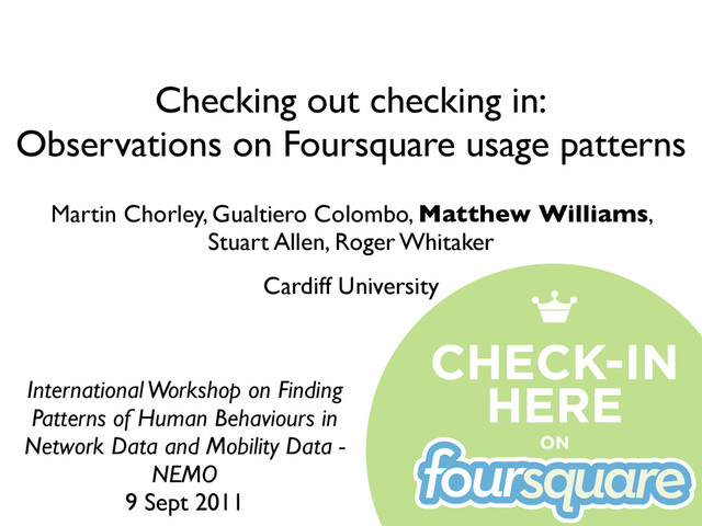 Workshop on Finding Patterns of Human Behaviours in Network Data and Mobility Data - NEMO 9 Sept 2011 Martin Chorley, Gualtiero Colombo, Matthew Williams, Stuart Allen, Roger Whitaker Cardiff University