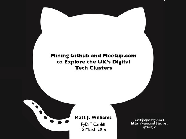 Tech Nation 2016 • Nesta-led project to map the state of the UK digital tech economy • Awesome report: – 27 digital tech clusters (regions) – Many datasets: big data, interviews, govt. stats – Many domains: firms, communities, skills demand, etc. • I contributed data collection and analytics for Github and Meetup.com • Data in this talk are drawn from my work on that project • Disclaimer: I’m not at Nesta! The project was led by the the awesome folks in Nesta’s Creative and Digital Economy team.