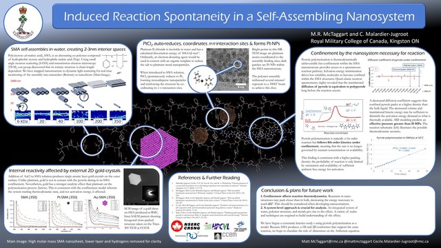 [email protected] Conclusion & plans for future work 1. Confinement affects reaction thermodynamics. Reactants in nano- structures may pack closer than in bulk, decreasing the energy necessary to reach ΔG‡. This should be considered when developing nanocontainers. 2. A system-level approach is crucial for analysis. An integrated system of water, polymer structure, and metals give rise to the effect. A variety of scales and techniques are required to build understanding of the effect. We have begun a systematic kinetics study s using pyrrole polymerization as a model. Because SMA produces a 1D and 2D conformer that support the same reaction, we hope to elucidate the role of dimension on the Arrhenuis equation. References & Further Reading 1. Malardier-Jugroot, Cecile, T. G. M. Van de Ven, and M. A. Whitehead. "Characterization of a novel self-association of an alternating copolymer into nanotubes in solution." Molecular Simulation 31.2-3 (2005): 173-178. 2. McTaggart, Matt, Cecile Malardier-Jugroot, and Manish Jugroot. "Self-assembled biomimetic nanoreactors I: Polymeric template." Chemical Physics Letters 636 (2015): 216- 220. 3. McTaggart, Matt, Cecile Malardier-Jugroot, and Manish Jugroot. "Self-assembled biomimetic nanoreactors II: Noble metal active centers." Chemical Physics Letters 636 (2015): 221-227. 4. Li, Xia, Matt McTaggart, and Cecile Malardier-Jugroot. "Synthesis and characterization of a pH responsive folic acid functionalized polymeric drug delivery system." Biophysical chemistry 214 (2016): 17-26. 5. Shah, Vishva, Cecile Malardier-Jugroot, and Manish Jugroot. "Mediating gold nanoparticle growth in nanoreactors: Role of template-metal interactions and external energy." Materials Chemistry and Physics 196 (2017): 92-102. SMA self-assembles in water, creating 2-3nm interior spaces Poly(styrene-alt-maleic acid), SMA, is an alternating co-polymer composed of hydrophobic styrene and hydrophilic maleic acid (Top). Using small angle neutron scattering (SANS) and transmission electron microscopy (TEM), our group discovered that its tertiary structure is chain length dependent. We have mapped nanostructure to dynamic light scattering for real-time monitoring of the assembly into nanotubes (Bottom) or nanosheets (Main Image). 6 kDa 20 40 100 200 350 ? ? 1000 nm 100 10 1 PtCl2 auto-reduces, coordinates π-π interaction sites & forms Pt-NPs Bright points in this HR- TEM image are platinum atoms coordinated to the assembly binding sites; dark patches are Pt NPs within the SMA nanostructure. The polymer assembly withstood several minutes’ exposure to a 300kV beam to achieve this shot. Platinum II chloride is insoluble in water and has a calculated dissociation energy of 308.4 kJ·mol-1. Ordinarily, an electron-donating agent would be used in concert with an organic template to reduce the salt to platinum metal nanoparticles. When introduced to SMA solution, PtCl2 spontaneously reduces to Pt, forming monodisperse nanoparticles and reinforcing the structure by co- ordinating its π-π interaction sites. Confinement by the nanosystem necessary for reaction Pyrrole polymerization is thermodynamically unfavourable but confinement within the SMA nanostructure provides access to a spontaneous reaction pathway. Solvation energy minimization drives low solubility molecules to become confined within the SMA structures. Quasi-elastic neutron spectrometry (right) revealed that the translational diffusion of pyrrole is equivalent to polypyrrole long before the reaction occurs. [PPy] = 0.0699t + 0.0435 R² = 0.9983 0 0.5 1 1.5 2 2.5 3 0 5 10 15 20 25 30 Absorbance, 465 nm Time (days) Pyrrole polymerization in SMA(6) at 50°C A decreased diffusion coefficient suggests that confined pyrrole packs at a higher density than the bulk liquid. The decreased volume and translational kinetic energy may be sufficient to diminish the activation energy demand to what is thermally available. MD modeling predicts an effective pressure greater than 10 MPa. The reaction schematic (left) illustrates the possible thermodynamic scenario. Pyrrole polymerization is typically a 1st order reaction but follows 0th order kinetics under confinement, meaning that the rate is no longer governed by reactant concentration or availability. This finding is consistent with a higher packing density: the probability of reaction is only limited by orientation and availability of sufficient ambient free energy for activation. Diffusion coefficient of pyrrole under confinement Internal reactivity affected by external 2D gold crystals Addition of AuCl to SMA solution produces single atomic layer gold crystals on the outer surface. Unlike platinum, gold is not in contact with the pyrrole during in its SMA confinement. Nevertheless, gold has a stronger catalytic effect than platinum on the polymerization process (below). This is consistent with the confinement model wherein the system starting thermodynamic state, and not activation energy, is affected. SMA (350) Pt-SMA (350) Au-SMA (350) SEM image of a gold sheet on SMA produced at RMC. Inset SAEM pattern showing hexagonal close-packed structure taken on the Titan- 300 TEM at CCEM.