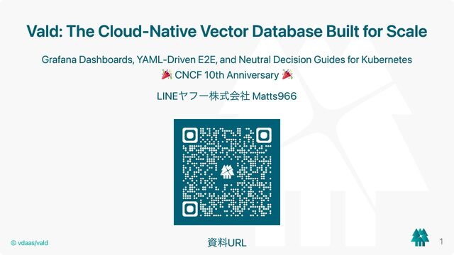 YAML-Driven E2E, and Neutral Decision Guides for Kubernetes CNCF 10th Anniversary LINEヤフー株式会社 Matts966 資料URL © vdaas/vald 1
