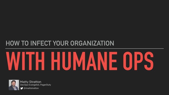 In this talk, I will discuss how the very DNA of an organization can evolve through the use of actionable communications from all levels - management, strategy, and practitioners. The “virus” of humane ops will infect your organization, providing a more sustainable approach to on-call, incident resolution, post-mortems, and more.