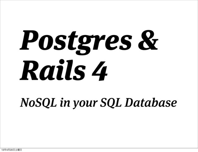 Postgres 9.2 brings the best of NoSQL to SQL, with features like hstore, PLV8, and the JSON datatype. Come learn how Rails 4 takes advantage of these and other advanced Postgres features, and how you can make your application more flexible and performant. This workshop is great for anyone new to either PostgreSQL or Rails 4.
