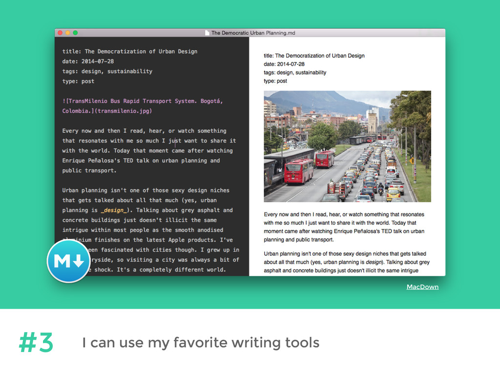 to mess around with ugly HTML code. Instead you create things like [links](http://postach.io) using a syntax that’s much easier to read. You can also do things like _italics_ and **bold** text. ## Headings are easy too! With Markdown you can stop worrying about HTML markup and just focus on your writing. #2 I can write in Markdown