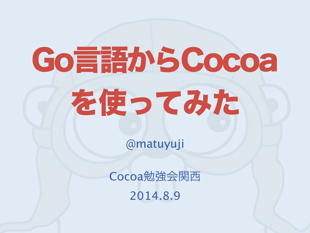 cocoa.NSRect{0,0, 200,200}, NSTitledWindowMask, NSBackingStoreBuffered, false) win.CascadeTopLeftFromPoint(cocoa.NSPoint{20,20}) win.SetTitle(cocoa.NSString_initWithUTF8String("SomeApp")) win.MakeKeyAndOrderFront(nil) app.ActivateIgnoringOtherApps(true) ! fmt.Println(app, win) fmt.Println(app.GetClassName(), win.GetClassName()) ! app.Run(); } ͜ͷίʔυ͕ಈ͘Α͏ʹ͍ͨ͠ʂ