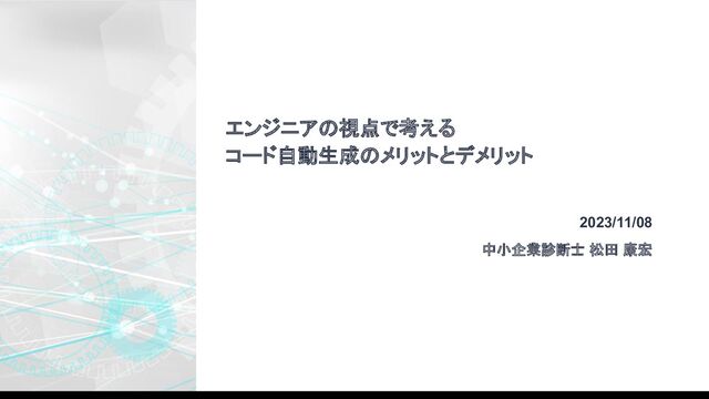 エンジニアの視点で考える コード自動生成のメリットとデメリット 2023/11/08 中小企業診断士 松田 康宏