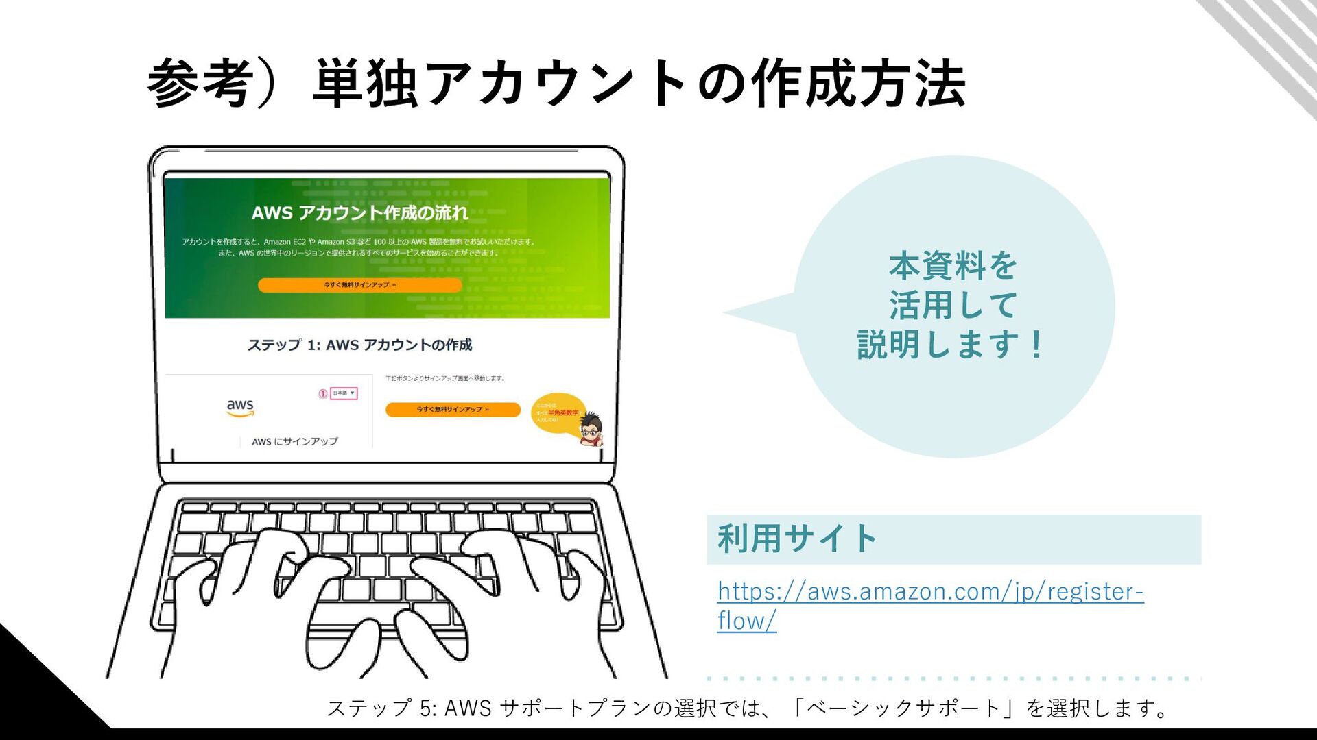 参考)単独アカウントの作成方法 利用サイト https://aws.amazon.com/jp/register- flow/ 本資料を 活用して 説明します! ステップ 5: AWS