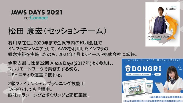 松田 康宏(セッションチーム) 石川県在住。2020年まで金沢市内の印刷会社で インフラエンジニアとして、AWSを利用したインフラの 概念実証を実施したのち、2021年1月よりイースト株式会社に転籍。 金沢支部には第22回 Alexa Days(2017年)より参加し、 フルリモートワークで業務をする傍ら、 コミュニティの運営に携わる。