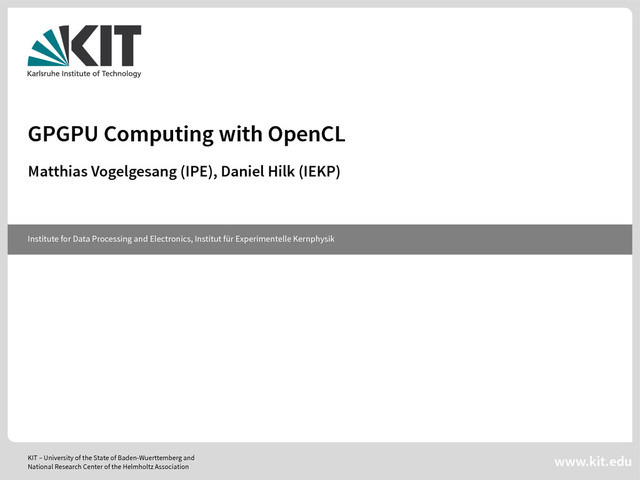 M. Vogelgesang - GPGPU Computing with OpenCL . Institute for Data Processing and Electronics, Institut für Experimentelle Kernphysik Institute for Data Processing and Electronics, Institut für Experimentelle Kernphysik GPGPU Computing with OpenCL Matthias Vogelgesang (IPE), Daniel Hilk (IEKP) KIT – University of the State of Baden-Wuerttemberg and National Research Center of the Helmholtz Association www.kit.edu