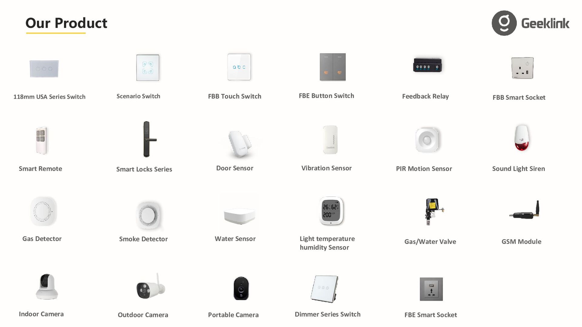 Button Switch Door Sensor Smart Remote Smart Locks Series Sound Light Siren Vibration Sensor PIR Motion Sensor Portable Camera Indoor Camera Outdoor Camera Feedback Relay Water Sensor Gas Detector Smoke Detector Gas/Water Valve Light temperature humidity Sensor GSM Module FBB Smart Socket Dimmer Series Switch FBE Smart Socket Our Product
