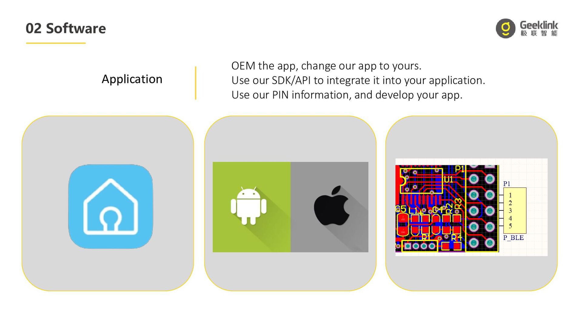to safeguard the public, work, and industrial space. System Features 02 Scalable Can adapt to all sizes of projects, from the tiny house to large enterprise building solutions with its Mesh technology. 03 Smart Wireless lighting, sensing, thermostat, and voice solution are included in our building automation system. 04 Simple Easy to install, set up, and manage via the tablet app. 05 Standard Use standard TSL BLE Mesh chipset, enable you to make your own firmware with pin. 06 Economic No complex wiring and controllers are required— lower system cost.