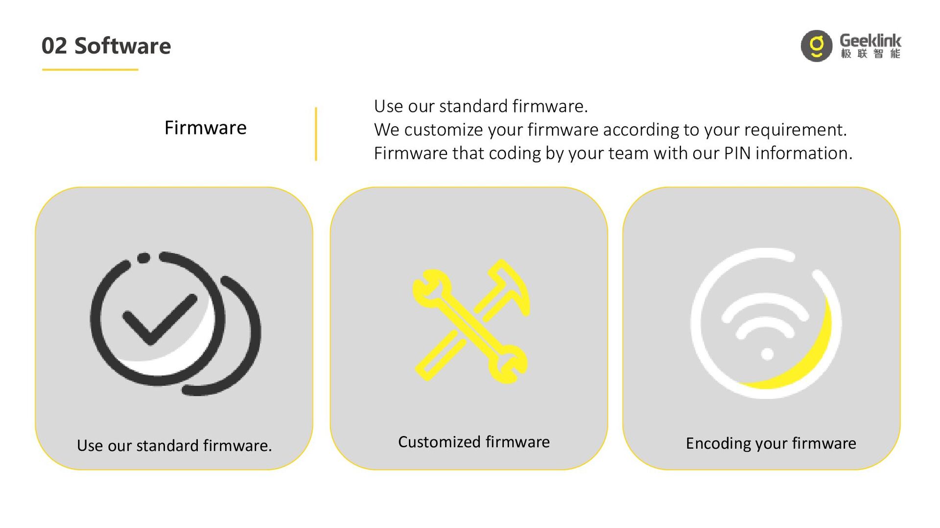 firmware Firmware Use our standard firmware. We customize your firmware according to your requirement. Firmware that coding by your team with our PIN information.