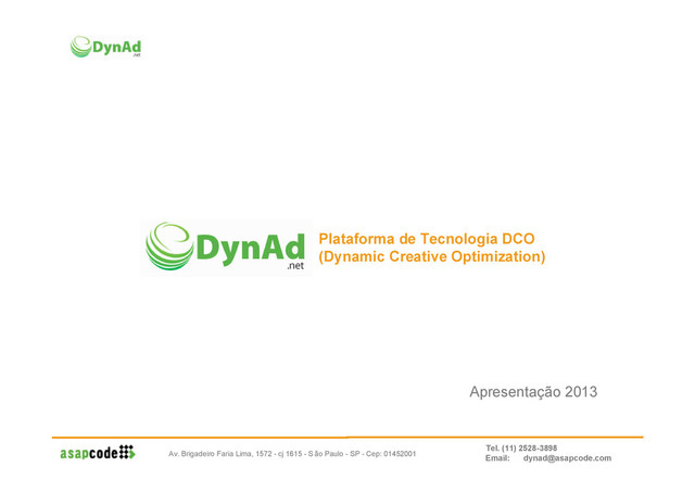 ão Paulo - SP - Cep: 01452001 Tel. (11) 2528-3898 Email: [email protected] DynAd é a tecnologia mais completa e flexivel do mercado para otimização dinâmica e inteligente de criativos D.C.O. Display Criative Optmization