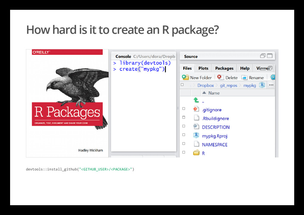 How hard is it to create an R package? devtools::install_github("<GITHUB_USER>/<PACKAGE>")