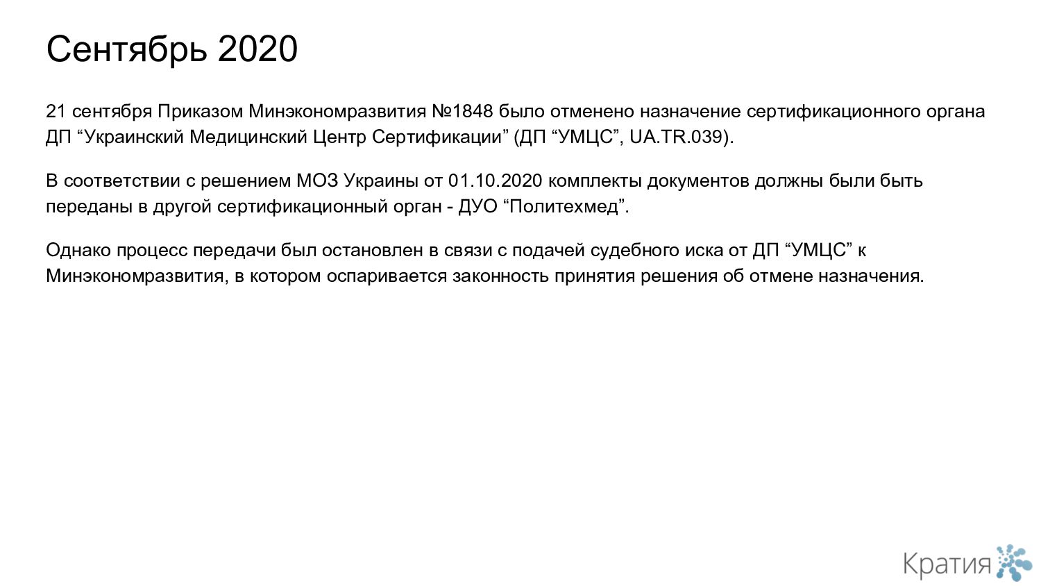 21 сентября Приказом Минэкономразвития №1848 было отменено назначение сертификационного органа ДП “Украинский Медицинский Центр Сертификации” (ДП “УМЦС”, UA.TR.039). В соответствии с решением МОЗ Украины от 01.10.2020 комплекты документов должны были быть переданы в другой сертификационный орган - ДУО “Политехмед”. Однако процесс передачи был остановлен в связи с подачей судебного иска от ДП “УМЦС” к Минэкономразвития, в котором оспаривается законность принятия решения об отмене назначения.