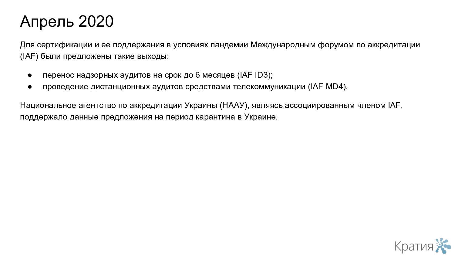 Национальное агентство по аккредитации Украины (НААУ), являясь ассоциированным членом IAF, поддержало данные предложения на период карантина в Украине.