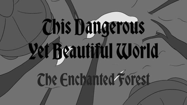 An explorer, lost in an enchanted forest, is lead towards an exit by the spirits of the wood.