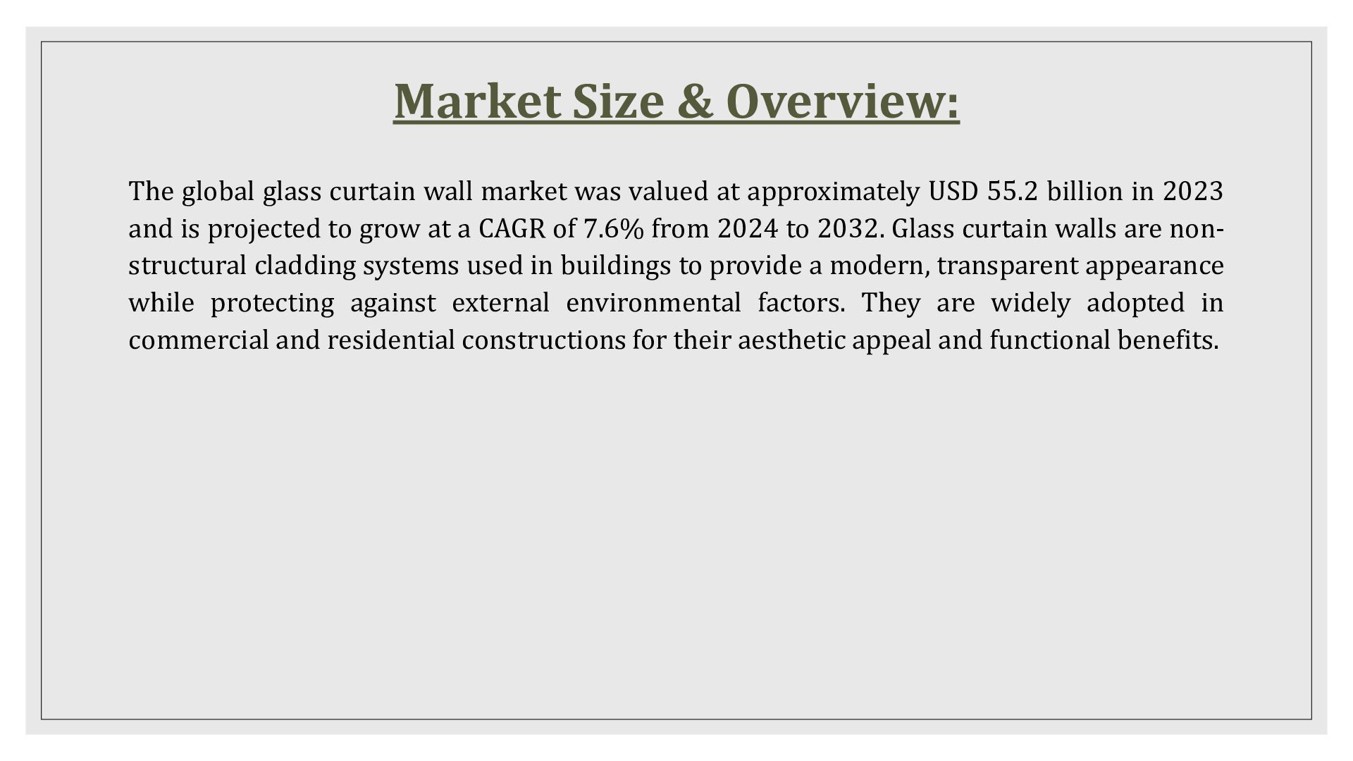was valued at approximately USD 55.2 billion in 2023 and is projected to grow at a CAGR of 7.6% from 2024 to 2032. Glass curtain walls are non- structural cladding systems used in buildings to provide a modern, transparent appearance while protecting against external environmental factors. They are widely adopted in commercial and residential constructions for their aesthetic appeal and functional benefits.