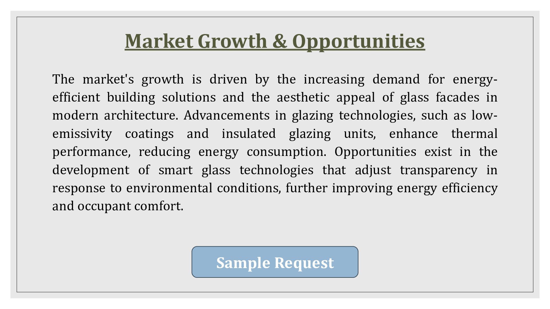 the increasing demand for energy- efficient building solutions and the aesthetic appeal of glass facades in modern architecture. Advancements in glazing technologies, such as low- emissivity coatings and insulated glazing units, enhance thermal performance, reducing energy consumption. Opportunities exist in the development of smart glass technologies that adjust transparency in response to environmental conditions, further improving energy efficiency and occupant comfort. Sample Request