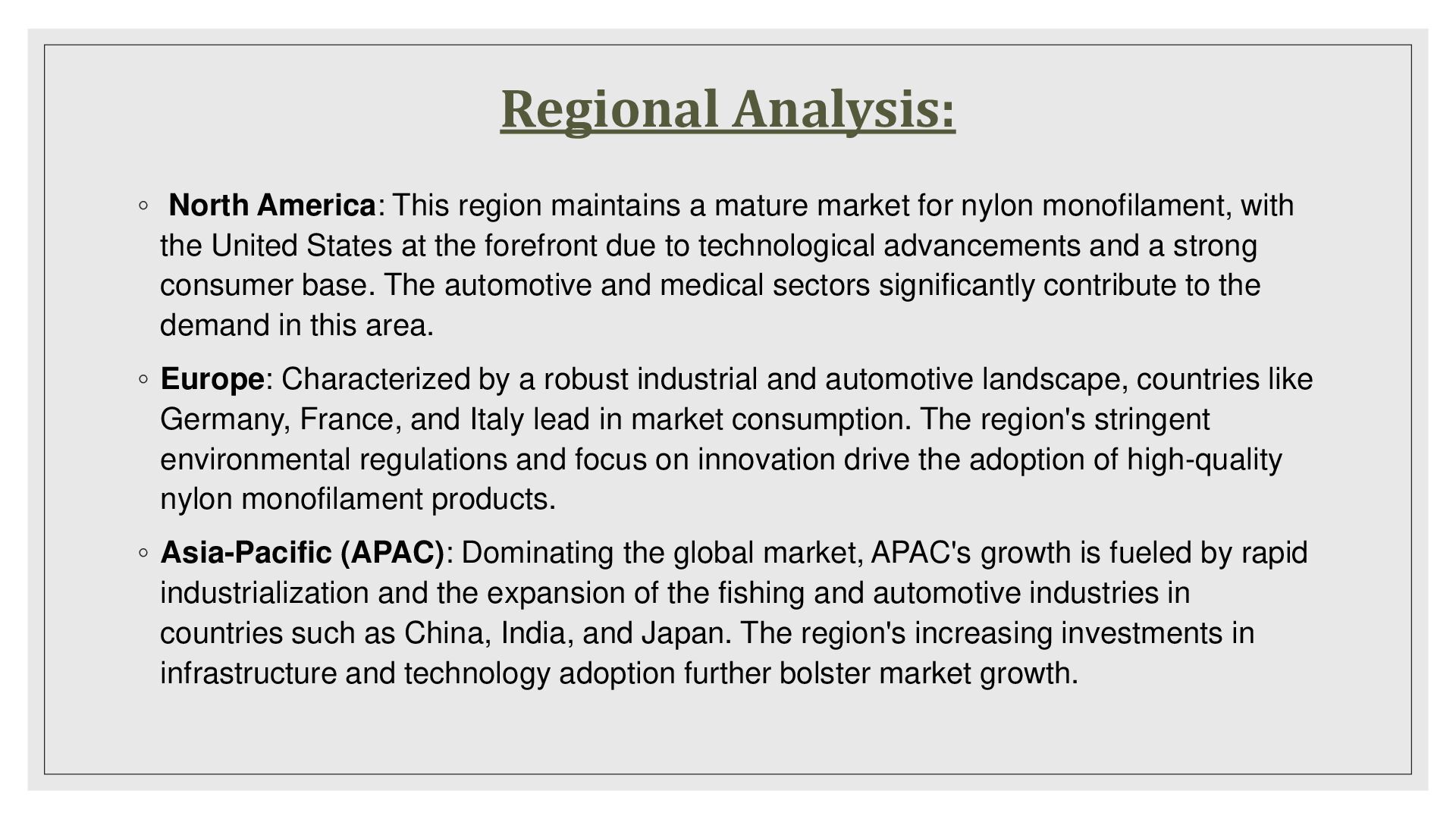 market for nylon monofilament, with the United States at the forefront due to technological advancements and a strong consumer base. The automotive and medical sectors significantly contribute to the demand in this area. ◦ Europe: Characterized by a robust industrial and automotive landscape, countries like Germany, France, and Italy lead in market consumption. The region's stringent environmental regulations and focus on innovation drive the adoption of high-quality nylon monofilament products. ◦ Asia-Pacific (APAC): Dominating the global market, APAC's growth is fueled by rapid industrialization and the expansion of the fishing and automotive industries in countries such as China, India, and Japan. The region's increasing investments in infrastructure and technology adoption further bolster market growth.