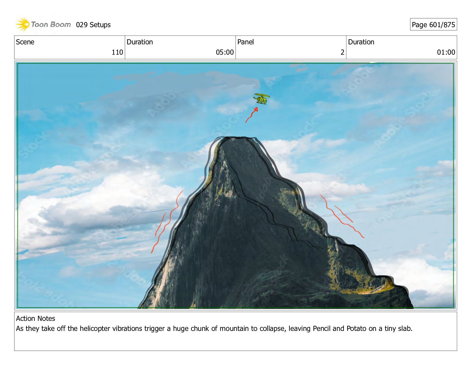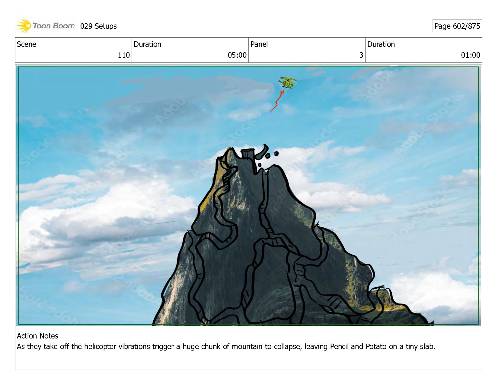 As they take off the helicopter vibrations trigger a huge chunk of mountain to collapse, leaving Pencil and Potato on a tiny slab. 029 Setups Page 603/875