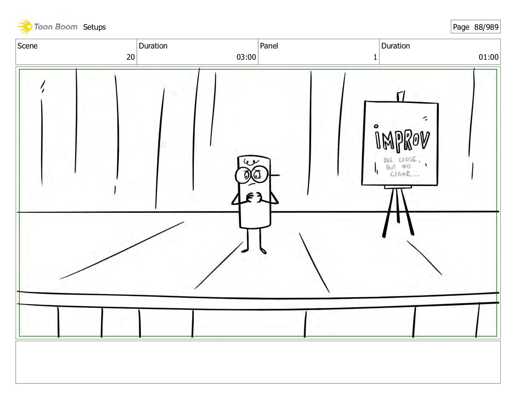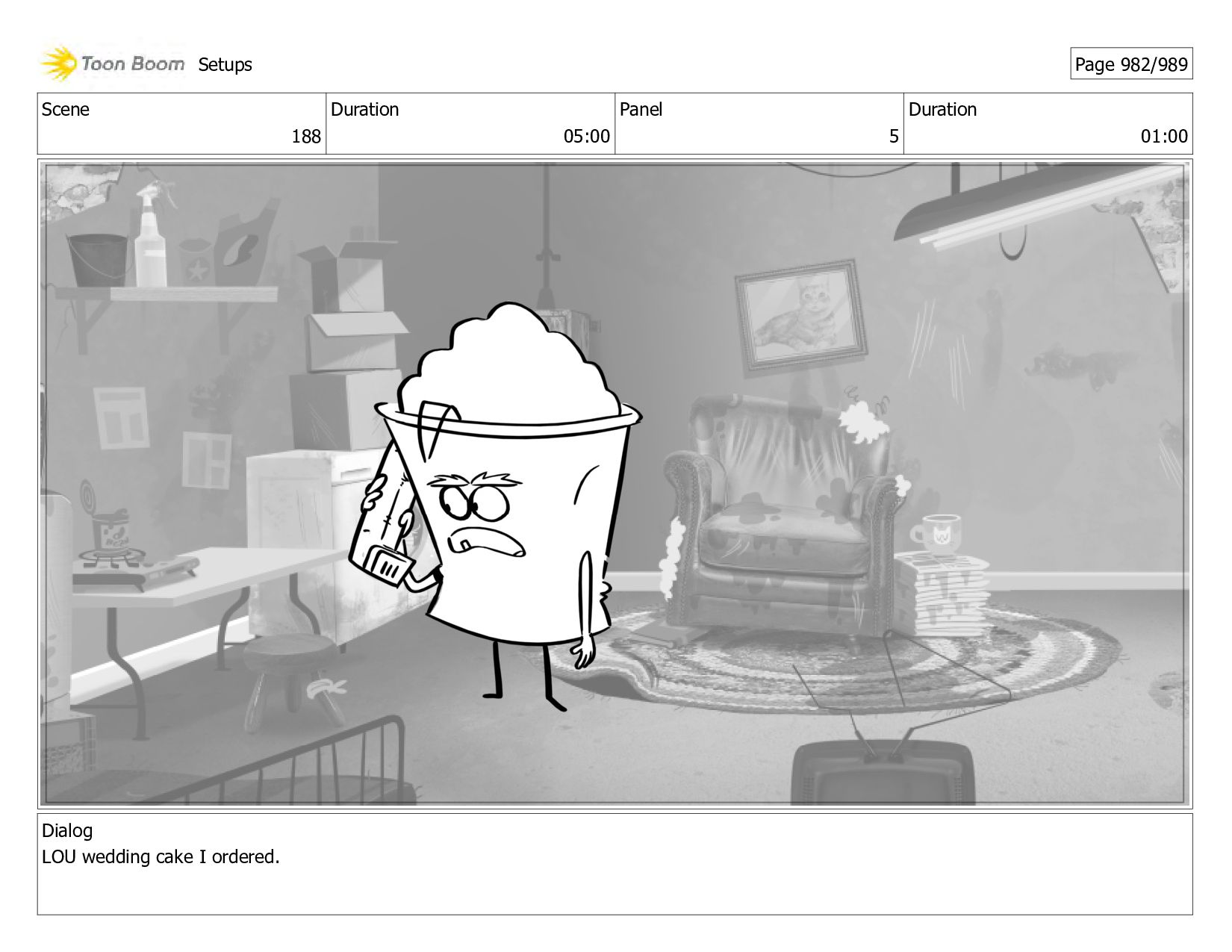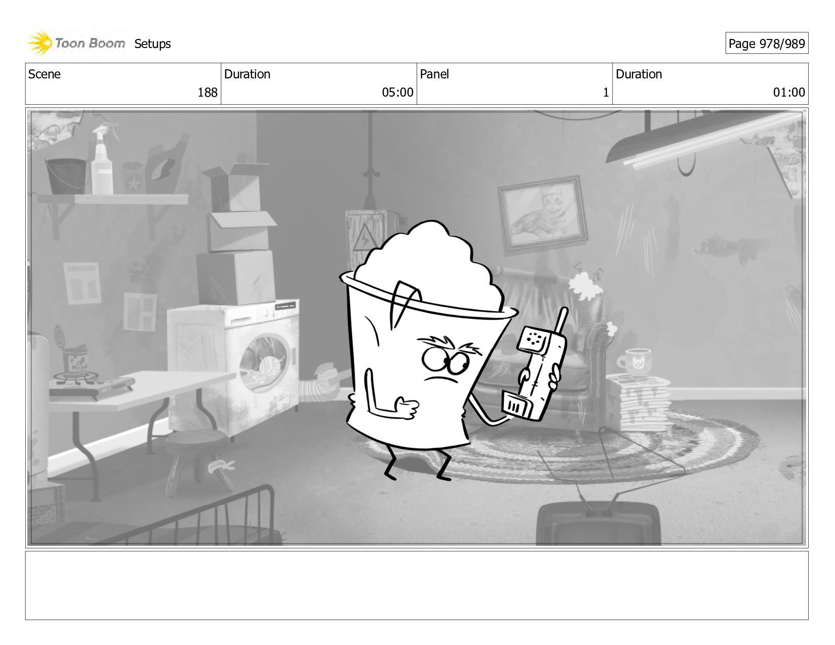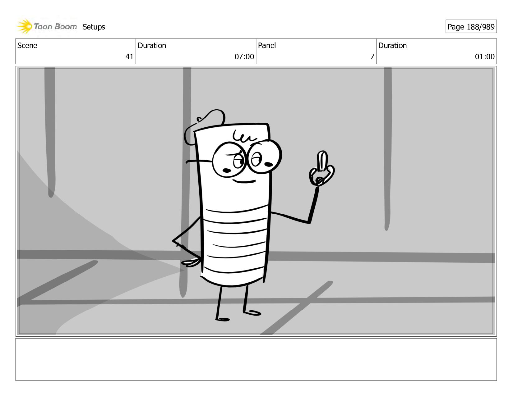 Scene 188 Duration 05:00 Panel 1 Duration 01:00 Setups Page