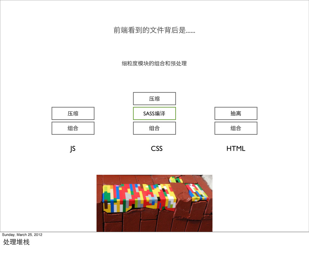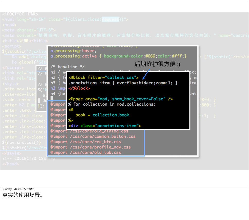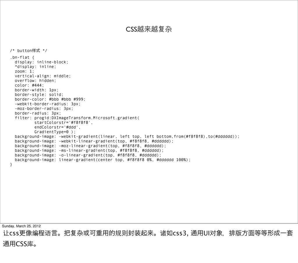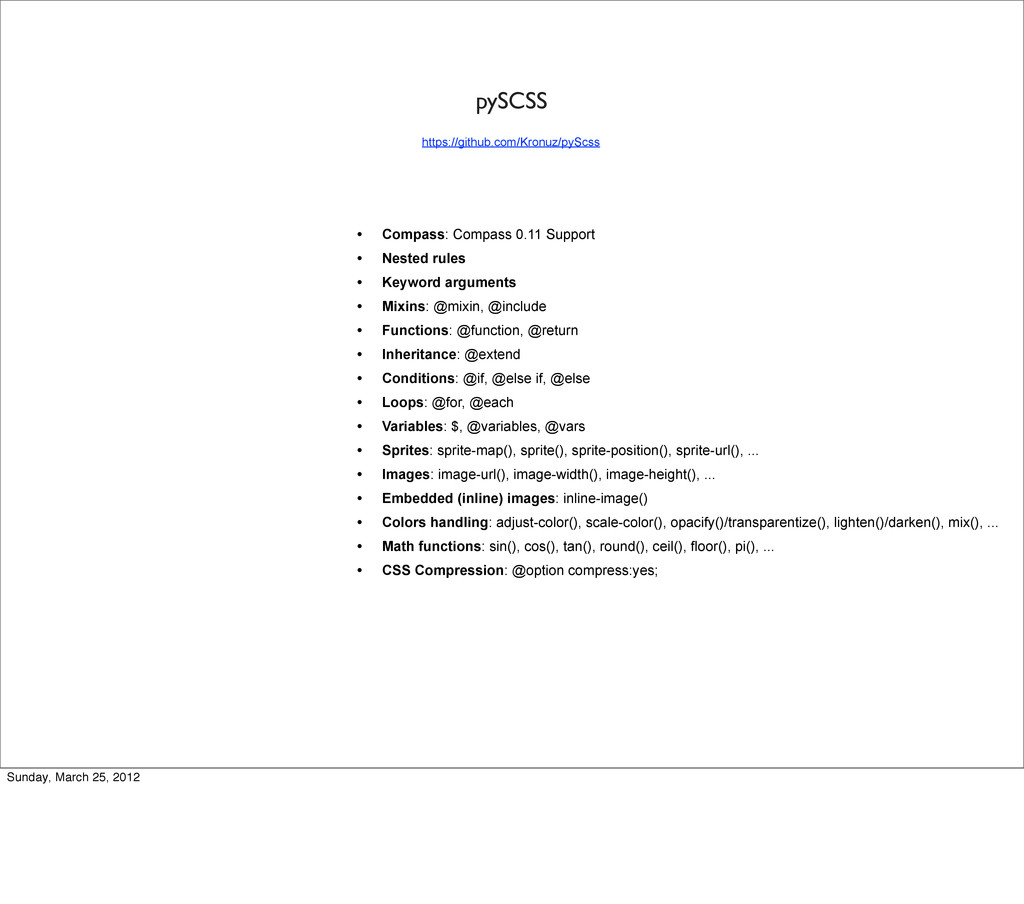 • Keyword arguments • Mixins: @mixin, @include • Functions: @function, @return • Inheritance: @extend • Conditions: @if, @else if, @else • Loops: @for, @each • Variables: $, @variables, @vars • Sprites: sprite-map(), sprite(), sprite-position(), sprite-url(), ... • Images: image-url(), image-width(), image-height(), ... • Embedded (inline) images: inline-image() • Colors handling: adjust-color(), scale-color(), opacify()/transparentize(), lighten()/darken(), mix(), ... • Math functions: sin(), cos(), tan(), round(), ceil(), floor(), pi(), ... • CSS Compression: @option compress:yes; Sunday, March 25, 2012