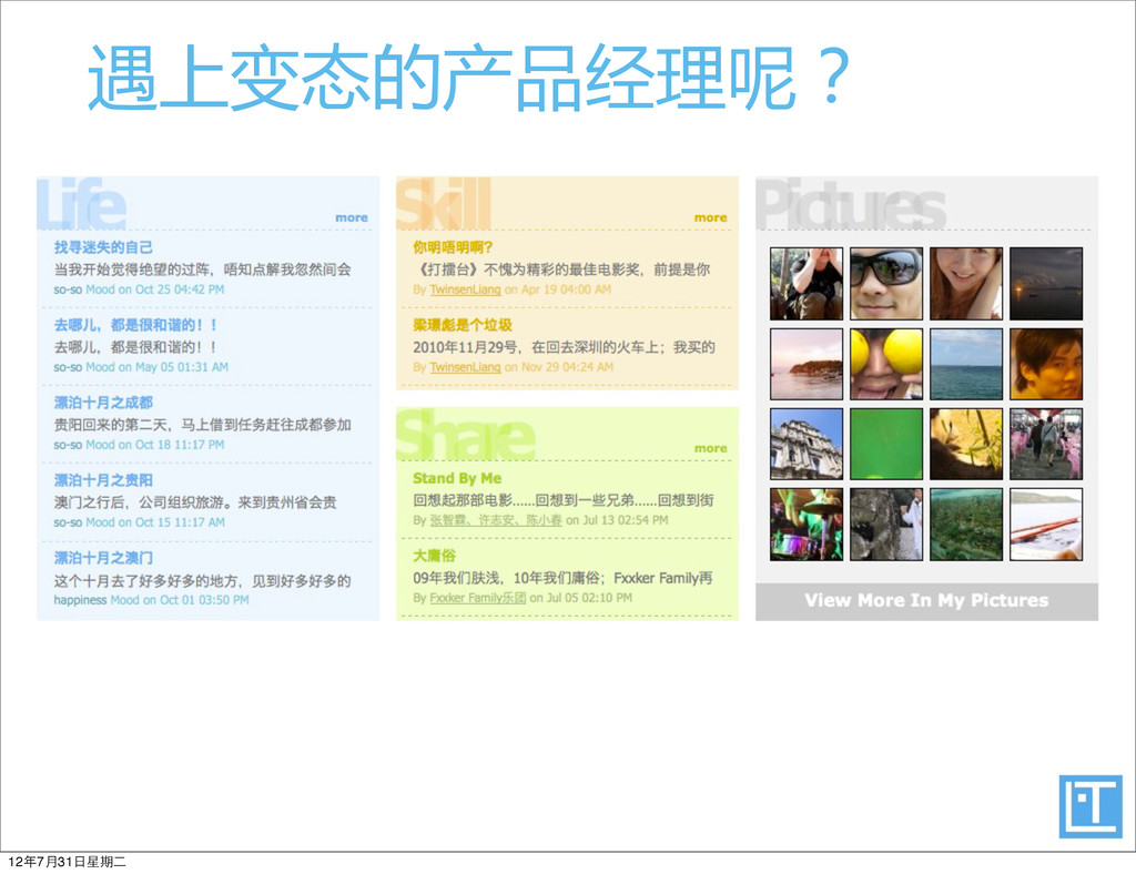 <h3 class="life">Life</h3> <div class="info">⋯⋯⋯⋯⋯⋯ </div> <a href="/life/" class="more">more</a> </div> <div id="middle"> <div id="skillcont"> <h3 class="skill">Skill</h3> <div class="info">⋯⋯⋯⋯⋯⋯ </div> <a href="/skill/" class="more">more</a> </div> <div id="sharecont"> <h3 class="share">Share</h3> <div class="info">⋯⋯⋯⋯⋯⋯</div> <a href="/share/" class="more">more</a> </div> </div> <div id="right"> <h3 class="pictures">Pictures</h3> <div id="pictures" class="info"></div> <a href="http://pictures.twinsenliang.net" class="more">View More In My Pictures</a> </div> </div> </div> 12年7月31⽇日星期⼆二
