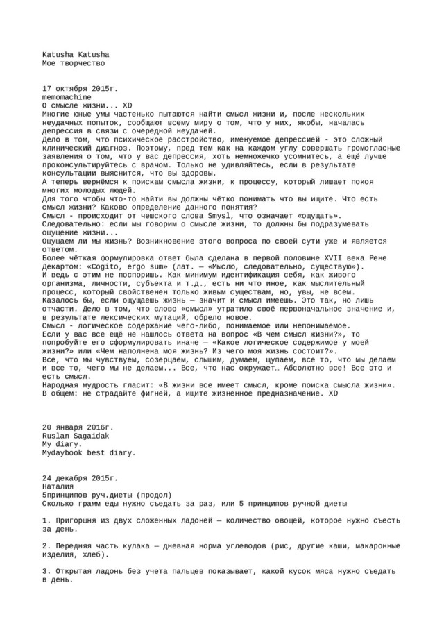 дневнике не будет записей. Много чего случится за это время. А может и нет. Жизнь уже более-мение идет своим чередом. Надеюсь, я не сдохну, не сопьюсь и не начну курить за эти пять дней. Пока, мой милый и любимый дневник. Я вернусь к тебе как только с могу. 18 сентября 2016г. Da Ri Мой дневник 18 сентября 2016г. Рина Кунц ,,,,,,,Запятые,,,,,,,,,,,,,,,, Пока Рина ждет, когда же докачается фильм на ее телефон, она сделает несколько записей. Все таки перешла на другой тариф. Более удобный. Везу своей девушке кольцо. Ну, подруга вообще-то. Мы ради прикола встречаемся. И тем более, что у нее есть парень, а я вообще одинок и не хочу отношений. Только вот так, по дружбе. Она называет меня своей женой. Я делаю так же. Моя подруга. Моя девушка. Моя жена. Время идет и я хочу спать. Но фильм еще не доконца загрузился. Блять, че ж так долго. Андрюхе можно все. Я пригласила его на чай из-за этого. Бож. Это немного странно. Но бля. Вчера сидим с ним такие, я ною "найдите мне мужика. Или бабу. Да хоть кого- нибудь". Он типа такой "вот же я". Но! Не встречайся с друзьями, не дружи с бывшими. С недавних пор решила, что это будет весьма полезное правило в моей жизни. Этот фильм никогда не акачается. "Тени незабытых педков". Рядом спит кошка. Моя крыса умерла. Ее полочка пуста. А я думала, все эти дни, что не была дома, думала, что он жив. Мой крысак. Ан нет. И мне даже не сказали. Расстаивать не хотели. А то, что я его люблю никого не ебет. Я устал. Меня бросила баба, которую я любил. Чувиха, которая мне очень сильно понравилась. . . Ее выселили из общаги и мы теперь не общаемся. Крыса, которую я любил, умерла. Подруга, я думала, что подруга, кинула меня. И теперь как бы сам по себе. Мне нормально. Мне хорошо. Когда тебя не ебет, что где-то есь кто-то, и кого-то не ебет, что где-то есть ты. Вообще заебись. То, что я начала использовать огромное кличество матов не освобождает меня от использования знаков препинания. Да, нужно ставить хотя бы запятые. Больше запятых. ,,,,,,,,,,,,,,,,,,,,,,,,,,, Еще больше! ,,,,,,,,,,,,,,,,,,,,,,,,,,,,,,,,,,,,,,,,,,. И еще немного ,,,,, Вот. Теперь хватит. 18 сентября 2016г. Цыпа Навеяло