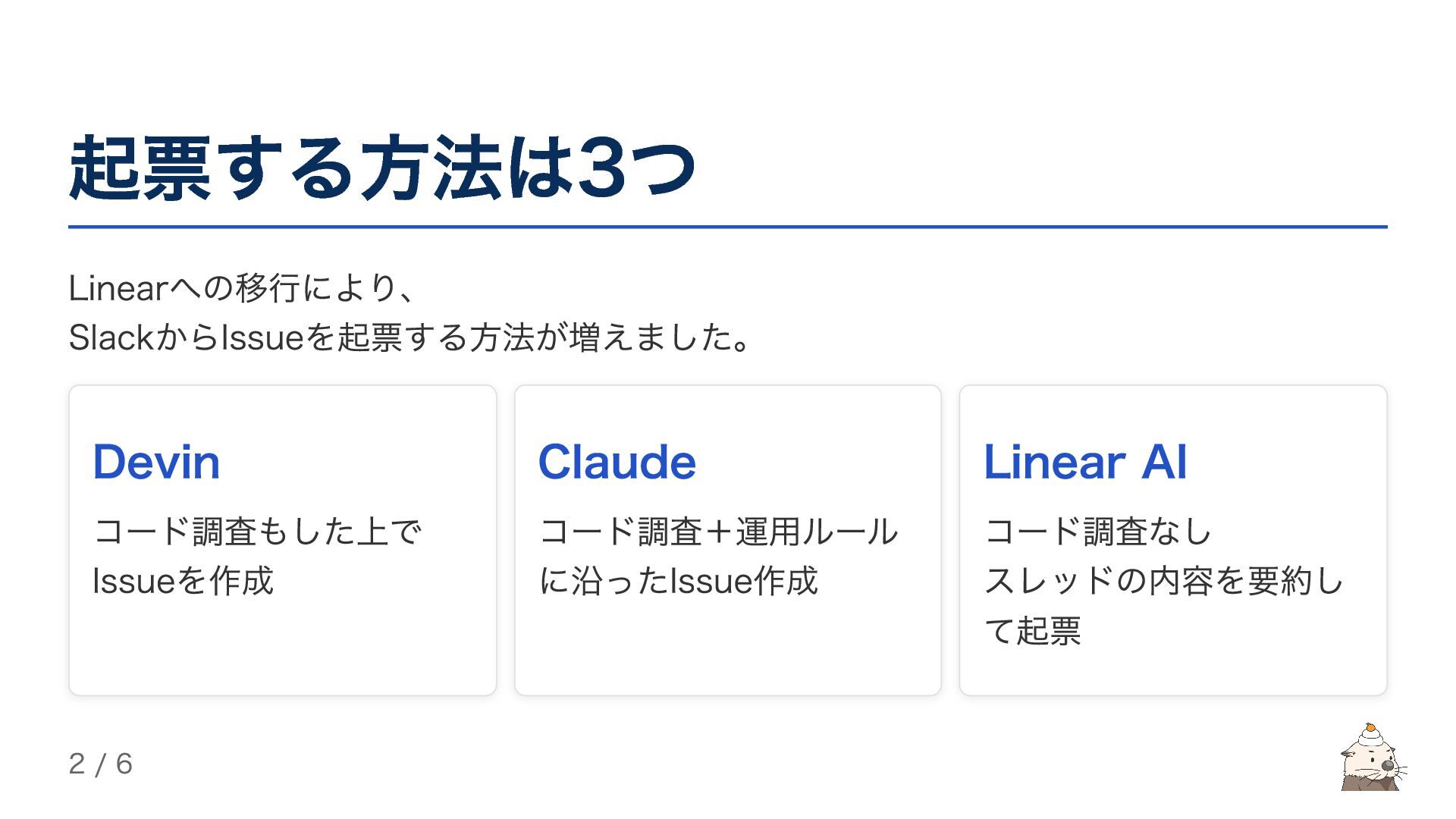 起票する方法は3つ Linearへの移行により、 SlackからIssueを起票する方法が増えました。 Devin コード調査もした上で Issueを作成 Claude コード調査+運用ルール に沿ったIssue作成 Linear