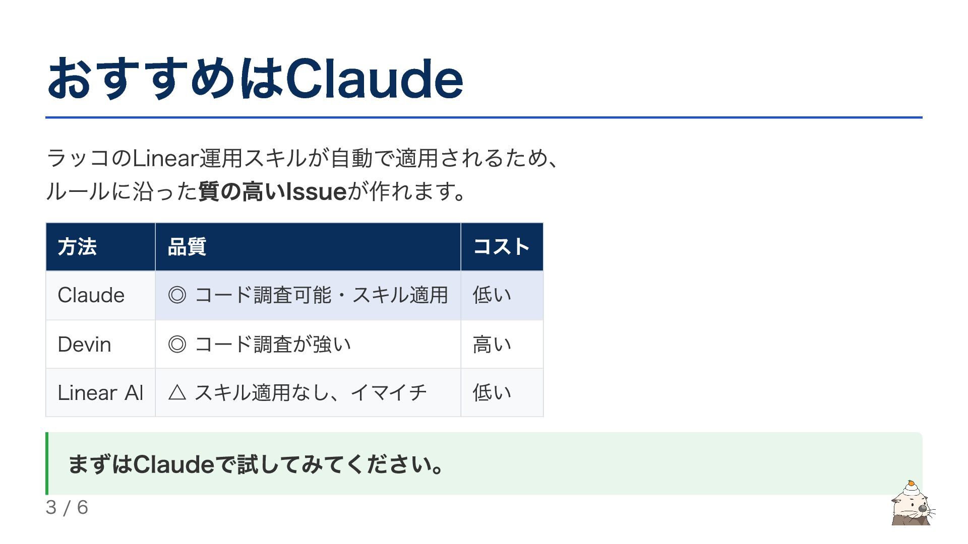 おすすめはClaude ラッコのLinear運用スキルが自動で適用されるため、 ルールに沿った質の高いIssueが作れます。 方法 品質 コスト Claude ◎ コード調査可能・スキル適用 低い