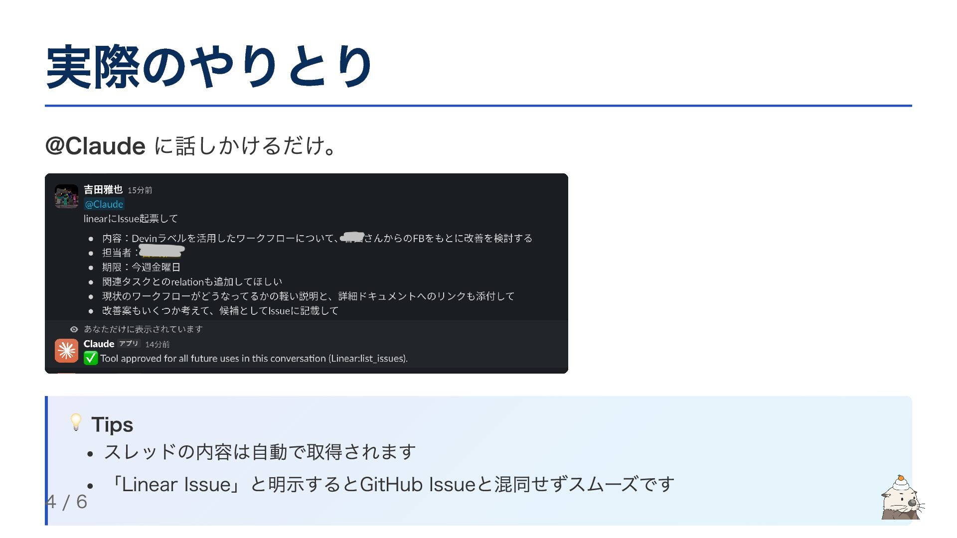 実際のやりとり @Claude に話しかけるだけ。 💡 Tips スレッドの内容は自動で取得されます 「Linear Issue」と明示するとGitHub Issueと混同せずスムーズです 4