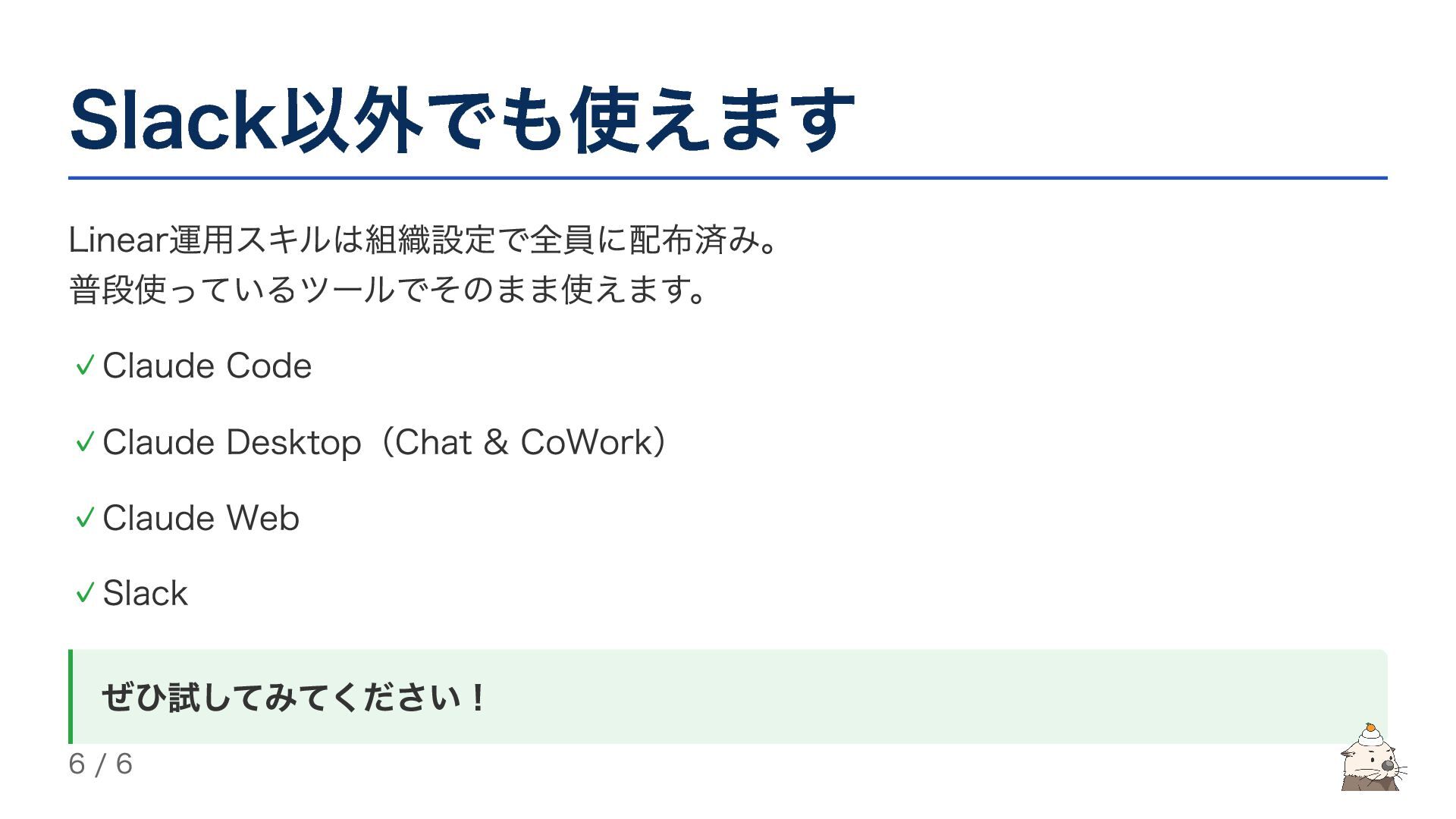 Slack以外でも使えます Linear運用スキルは組織設定で全員に配布済み。 普段使っているツールでそのまま使えます。 ぜひ試してみてください! Claude Code ✓ Claude Desktop(Chat &