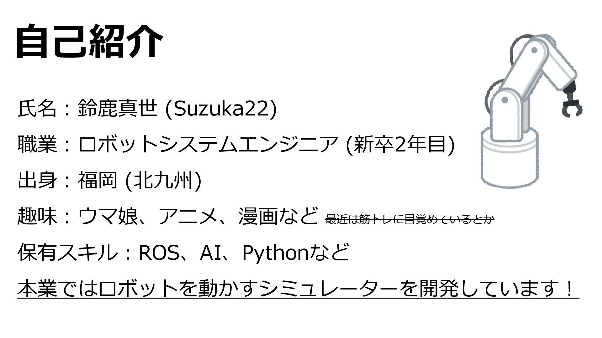 自己紹介 氏名:鈴鹿真世 (Suzuka22) 職業:ロボットシステムエンジニア (新卒2年目) 出身:福岡 (北九州) 趣味:ウマ娘、アニメ、漫画など 最近は筋トレに目覚めているとか 保有スキル:ROS、AI、Pythonなど