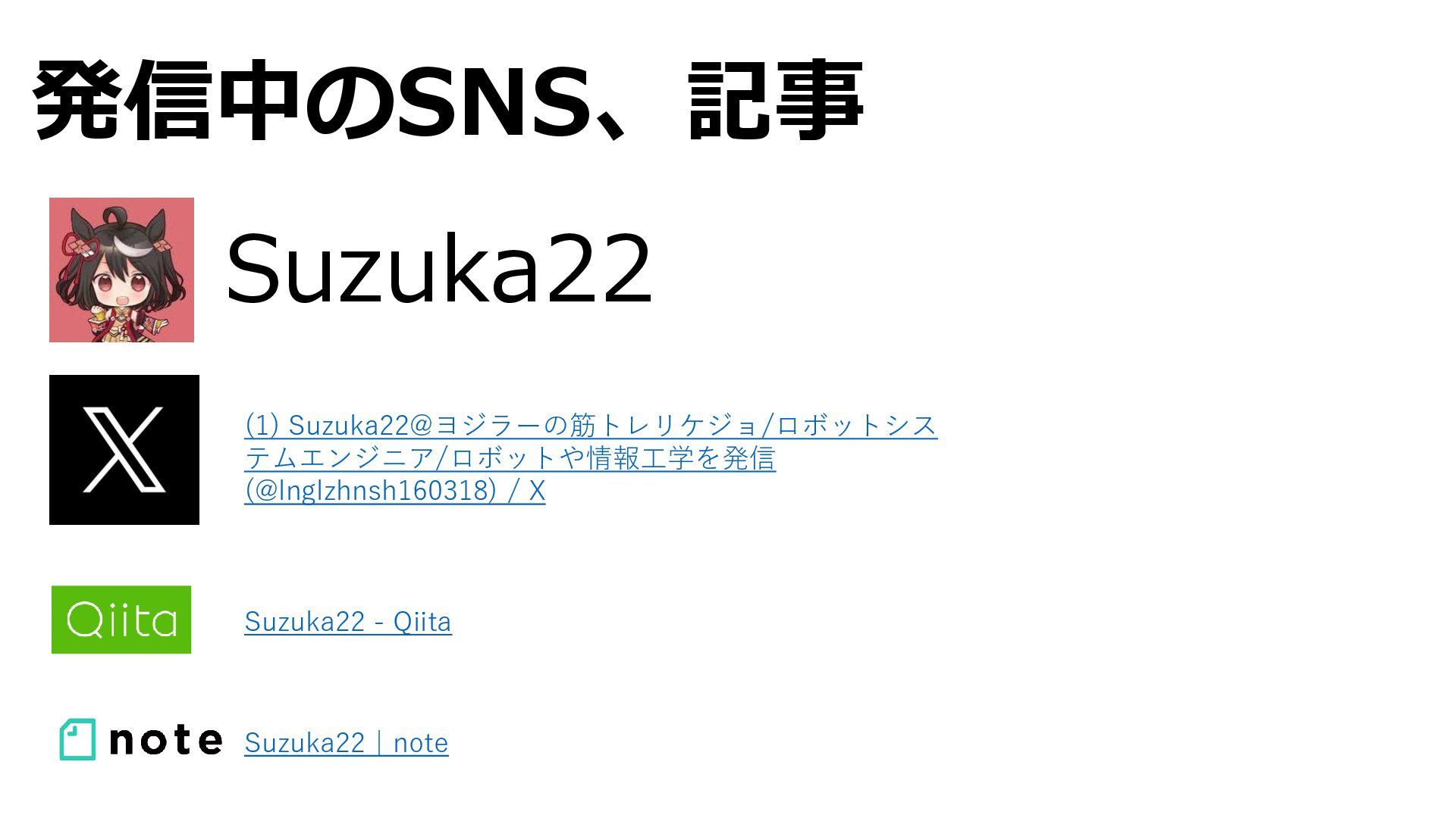 発信中のSNS、記事 Suzuka22 (1) Suzuka22@ヨジラーの筋トレリケジョ/ロボットシス テムエンジニア/ロボットや情報工学を発信 (@lnglzhnsh160318) / X Suzuka22 -