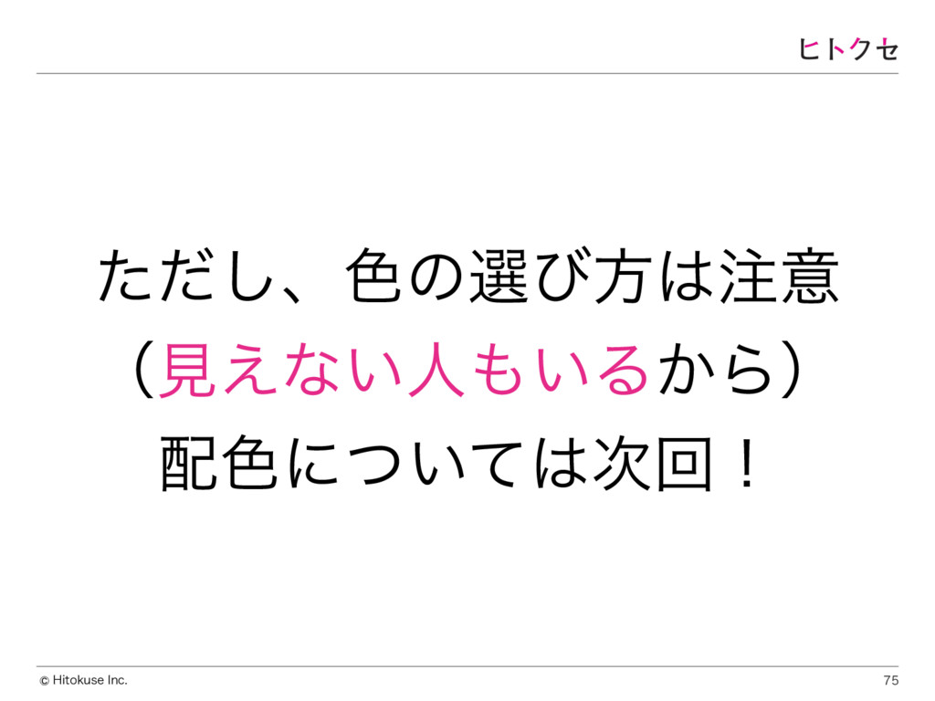 )JUPLVTF*OD Πϯσϯτ͚ͭΔ͔͚ͭͳ͍͔ϋοΩϦ͢ΔɻʢΘ͔Μͳ͖Ό͚ͭͳ͍͍ͯ͘ʣ ཁૉΛἧ͑ɺݟग़͠ͱͷδϟϯϓΛߴཱͯͨͤ͘͠Δɻ ηϯλʔدͤॳ৺ऀʹ͍͠ɻແବͳ০ආ͚Δɻ ৭ͷϧʔϧʹԊͬͨ৭͚ͩΛ༻͢Δ ຊʹڧௐ͍ͨ͠ͱ͜ΖҎ֎ʹ০͠ͳ͍ɻେࣄͳϙΠϯτ ݟग़͠ʹॻ͍ͯ͋Δͣɻ Ͳ͏ͯ͠ڧௐ͍ͨ͠߹৭ͷϧʔϧʹଇͬͯɺదͳ৭