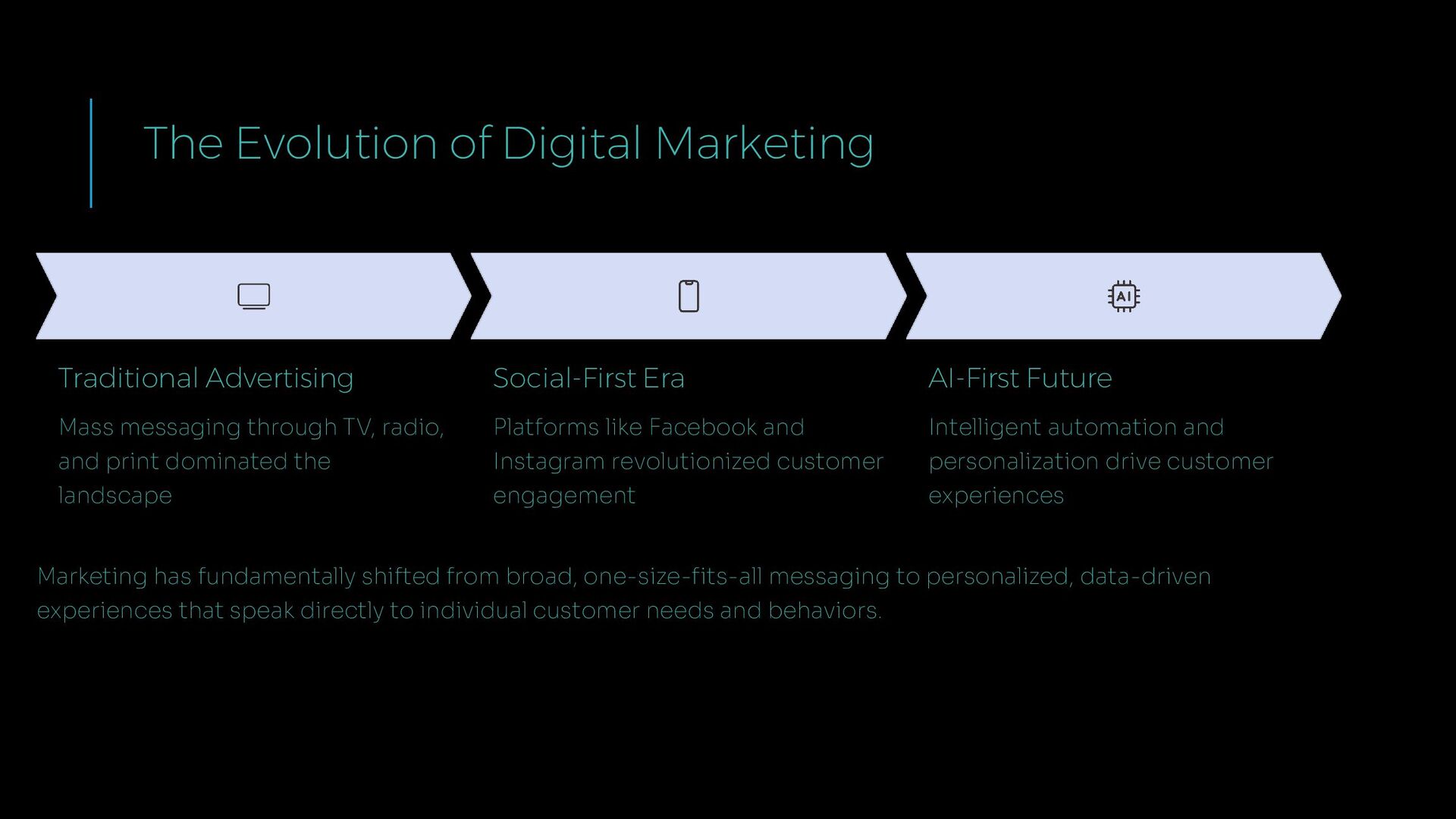TV, radio, and print dominated the landscape Social-First Era Platforms like Facebook and Instagram revolutionized customer engagement AI-First Future Intelligent automation and personalization drive customer experiences Marketing has fundamentally shifted from broad, one-size-fits-all messaging to personalized, data-driven experiences that speak directly to individual customer needs and behaviors.